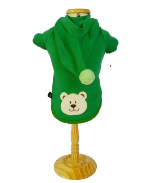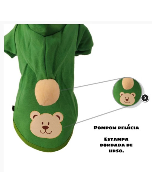 • Roupinha na cor verde, aplique de ursinho marron nas costas, com capuz e um pompom branco na ponta