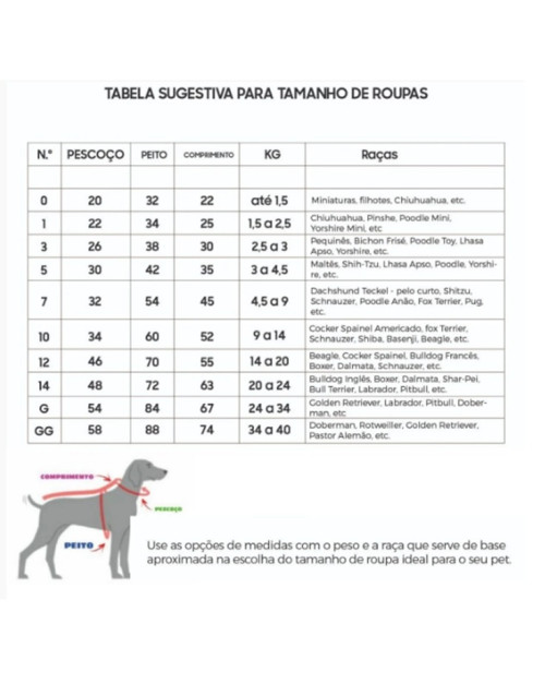 **Antes de comprar meça seu pet conforme a imagem disponibilizada e depois consulte a tabela de medidas, para selecionar o tamanho certo da roupinha.