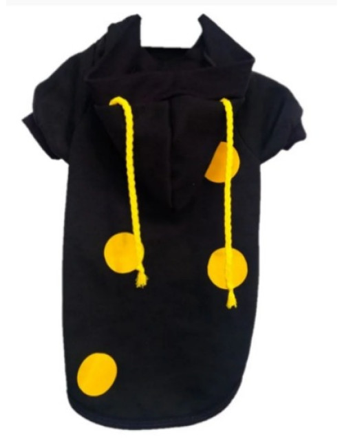 • Roupinha na cor preta e estampas emborrachadas de bolinhas amarelas, capuz com cordão amarelo
